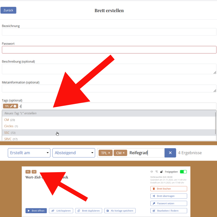 Dein Index ist zum Tag-Feld geworden und funktioniert jetzt als echtes Schlagwort, mit dem du deine Bretter z.B. in unterschiedliche Kategorien einsortieren kannst. Du kannst also sozusagen Ordner erstellen (z.B. für alle Bretter eines Klienten) und ein Brett in mehrere ‚Ordner gleichzeitig einordnen.